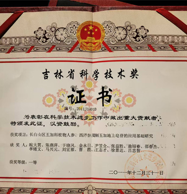 曾于2011年,作为项目主要完成人之一,获得吉林省省科学技术奖一等奖,获奖项目为:长白山区五加科植物人参、西洋参及刺五加地上皂苷的应用基础研究。